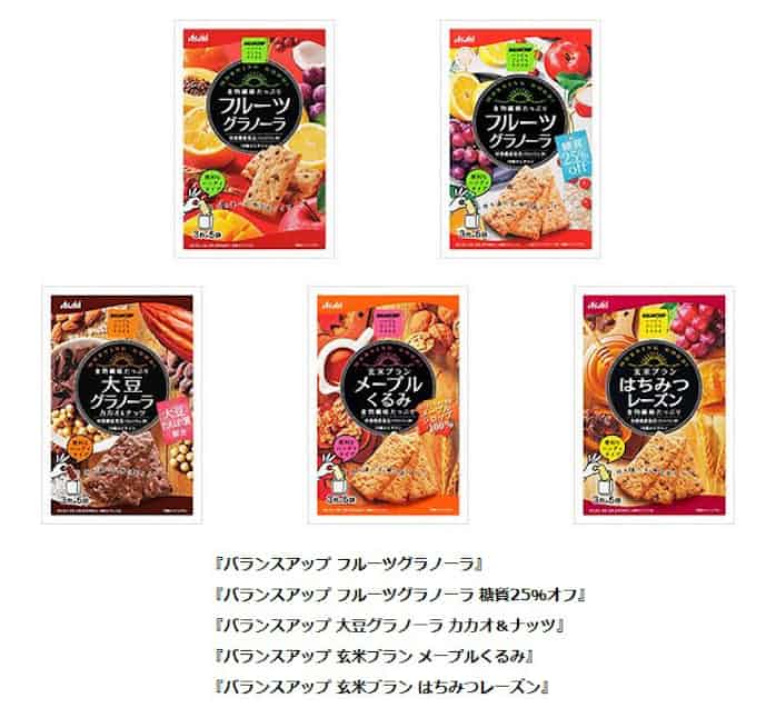 手軽に食べられる固形タイプのグラノーラ バランスアップ フルーツグラノーラ 糖質25 オフ バランスアップ 大豆グラノーラ カカオ ナッツ 18年8月27日 月 新発売 アサヒグループ食品